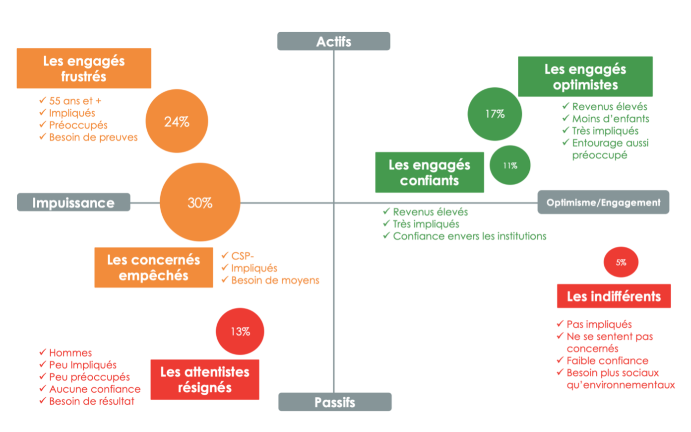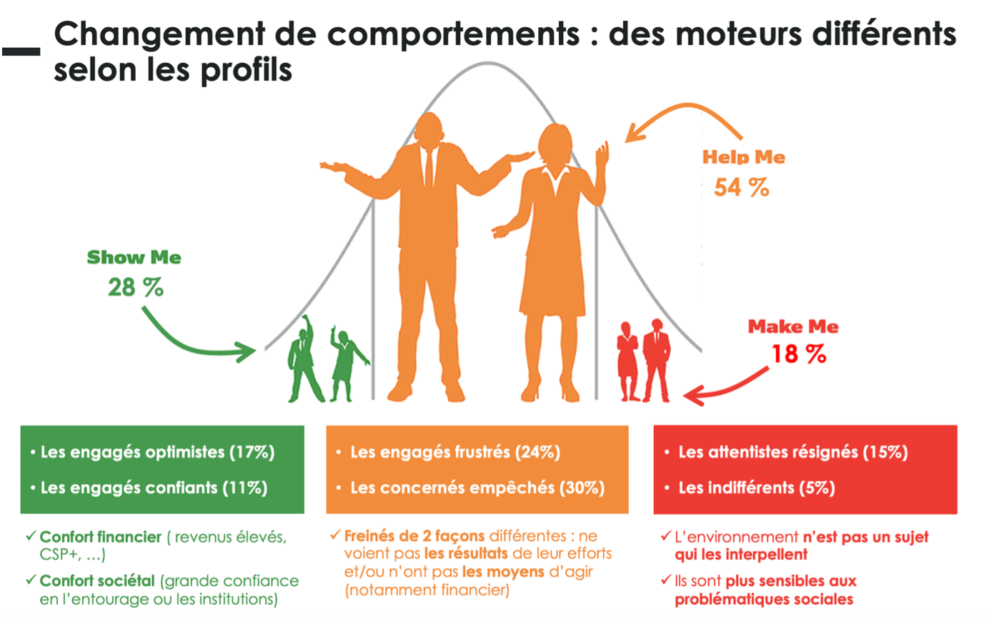 - La grande majorité (« Help me »), 65 à 70%, plutôt attentistes mais d’accord pour passer à l’acte pour peu qu’on leur offre une aide concrète et qu’on comprenne leurs contraintes. En matière d’environnement ils ont besoin d’être encouragés, qu’on leur démontre ce qui est à leur portée et de mieux sentir que leur action est efficace (sentiment d’efficacité personnelle).