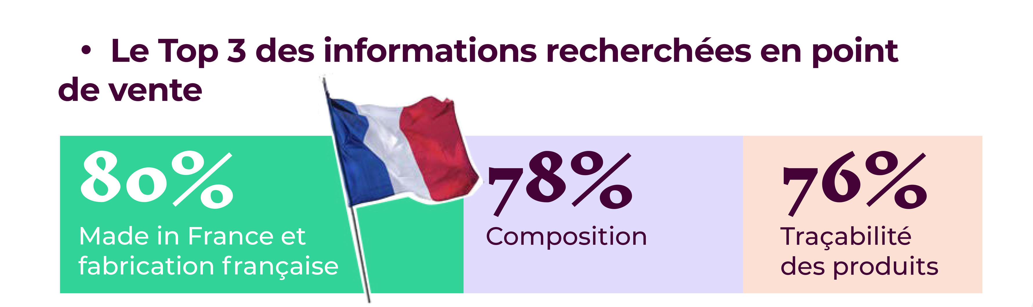 Avec 80% des Français influencés par le caractère responsable d’une marque, les critères de choix ont évolué vers des pratiques plus respectueuses avec en top 3 des informations recherchées : le made in France suivi par la composition puis la traçabilité des produits.