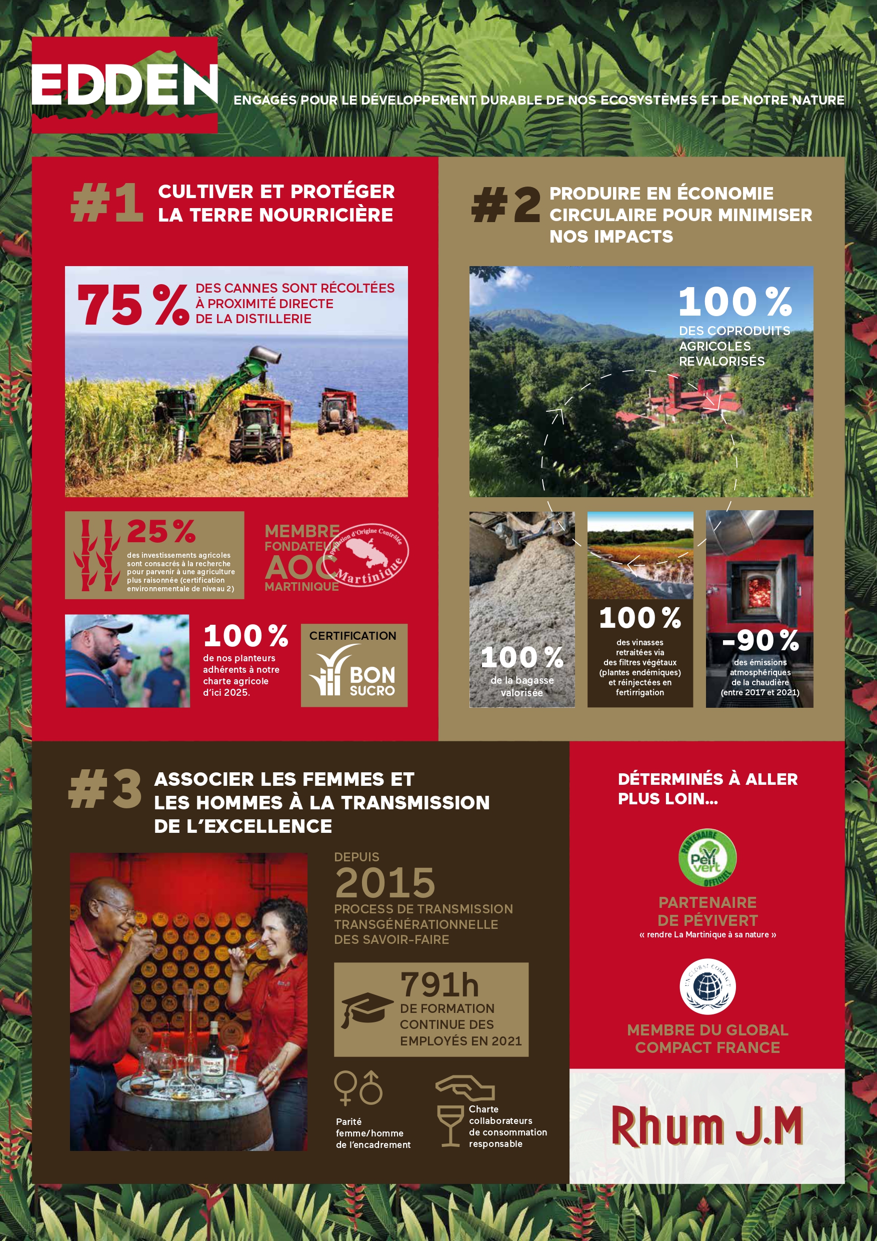 Depuis 2020,  LinkUp Factory accompagne Rhum J.M dans la formalisation de sa stratégie RSE et dans la révélation de sa démarche d’engagements. De ce travail en co-construction est né la démarche EDDEN : « Engagés pour le Développement Durable de nos Écosystèmes et de notre Nature ». EDDEN permet à Rhum J.M de présenter sa démarche RSE en traduisant sa sincérité, sa singularité et son authenticité.
